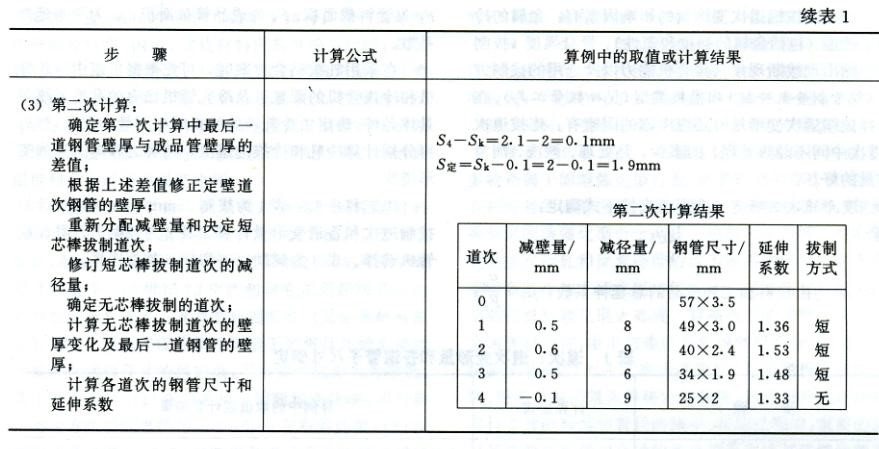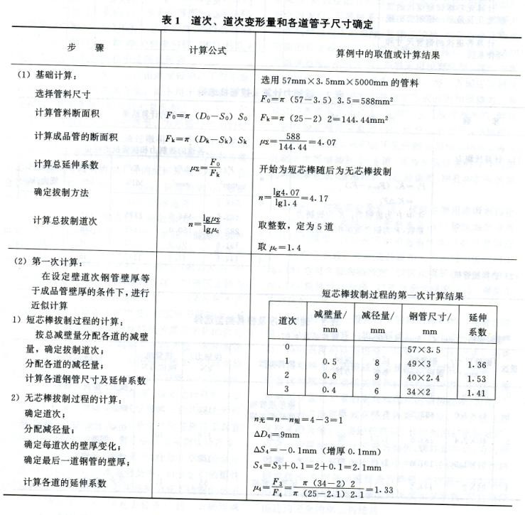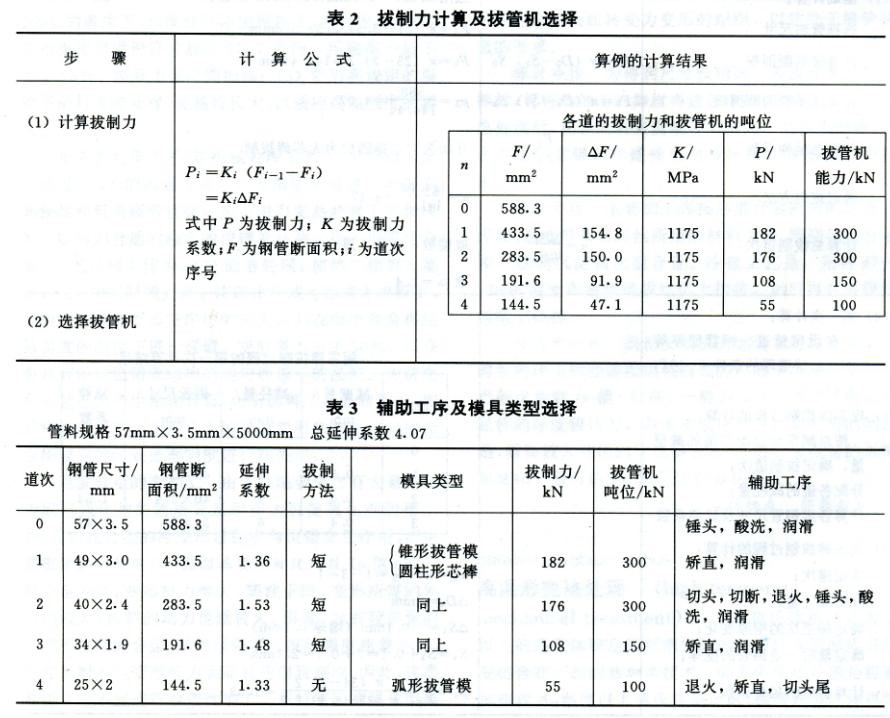 在采用軋拔結(jié)合方案時(shí),可先根據(jù)機(jī)組中冷軋管機(jī)和冷拔管機(jī)的配置以及冷軋管機(jī)已有的孔型系統(tǒng)等具體條件,確定由冷軋轉(zhuǎn)為冷拔時(shí)中間管的尺寸,然后再分別計(jì)算冷軋和冷拔的道次,兩者之和即為總的變形道次。工藝程序表 表1為拔制25mmx2mm鍋爐管的拔制道次和各道變形量計(jì)算。表2為拔制力計(jì)算和拔管機(jī)選擇。表3為輔助工序和模具類型選擇。